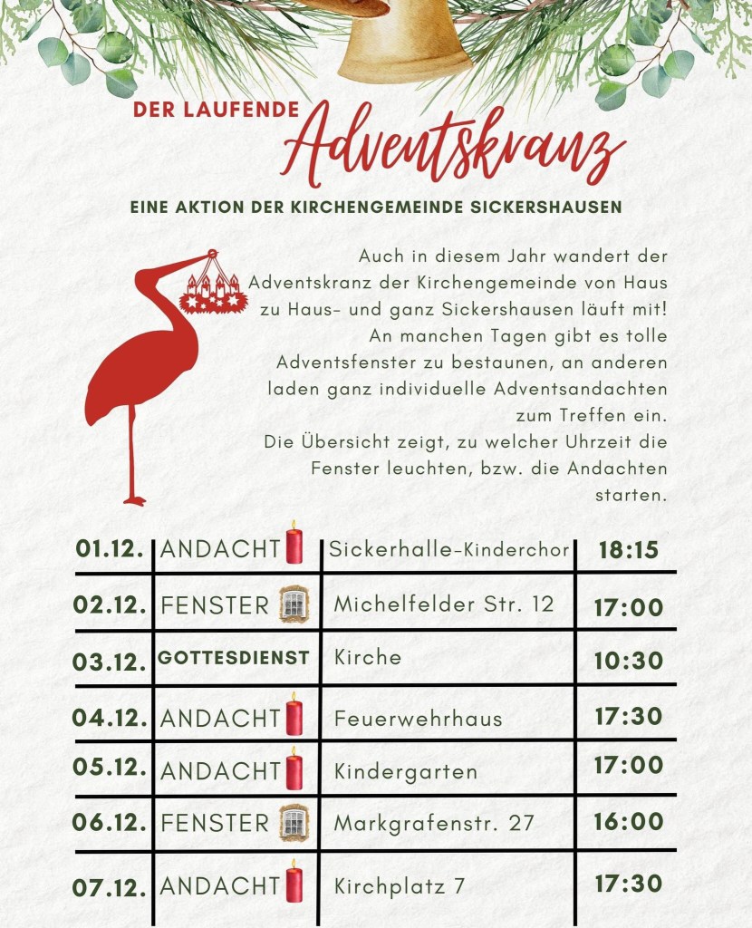 Beginn 18:15 Uhr in der Sickerhalle. Mehr zum „Laufenden Adventskranz“ auf der Webseite von Sickershausen.