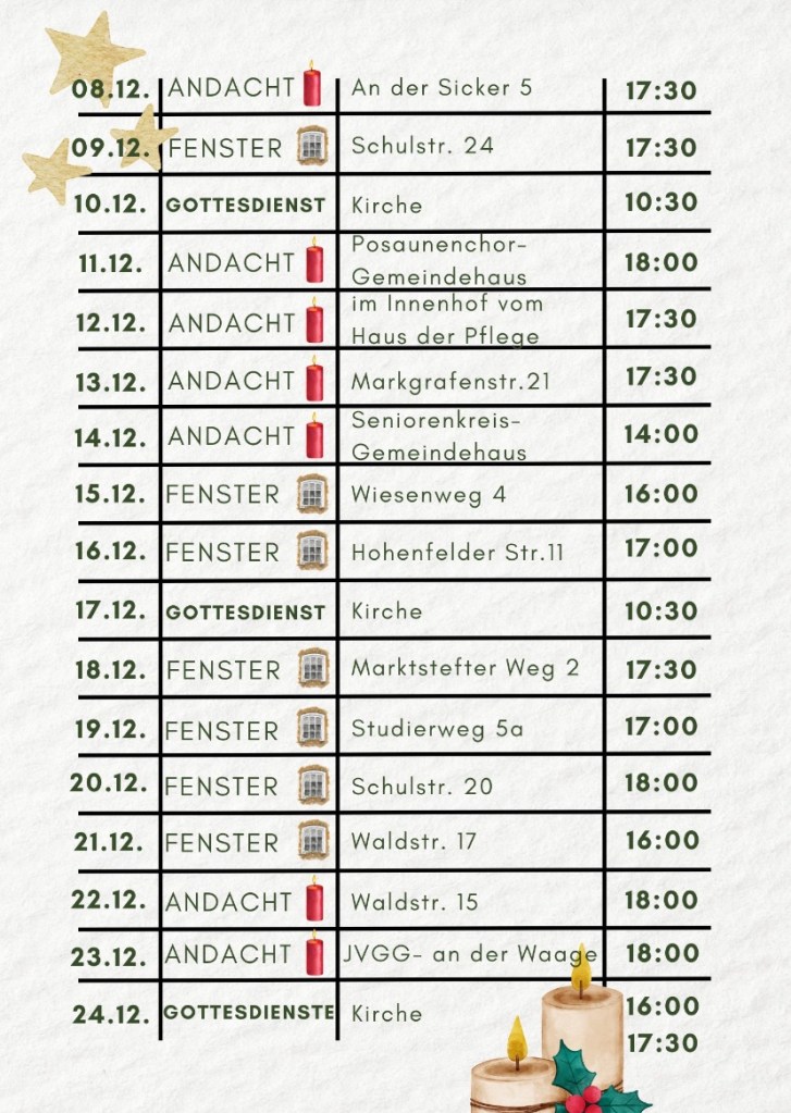 Am Freitag, 1. Dezember eröffnen unsere Nachwuchschöre Sicantini und Sicanti in Sickershausen im Rahmen einer Andacht den Laufenden Adventskranz mit.