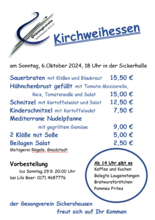Mir ham Kerm… und zwar vom 3. bis zum 7. Oktober, denn dann heißt es wieder am langen Wochenende: Mit dabei sind wir, Sicantiamo mit fleißiger Bewirtung am Sonntag in der Sickerhalle. Wenn ihr also Lust habt, Spaß haben wollt und ein gutes Essen in bester Gesellschaft mit Familie und Freunden genießen wollt, hier gibt‘s die Speisekarte zur Kerm. Flugs bestellt bis 29. September bei Lilo Beer, Telefonnummer steht unten… wir freuen uns auf euch … 🫶🍻🎠⛪️